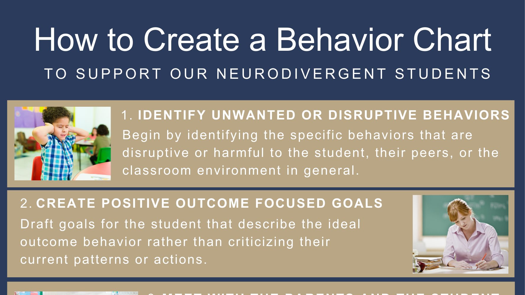 Using Canva, I designed a Job Aid as a reference for teachers to use when creating behavior charts. I wrote a summary of each step, and selected images to illustrate each component of the process. This job aid is included as a part of the Reactive Approaches lesson in my eLearning about behavior management in a neurodiverse classroom.